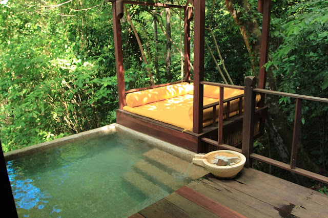 There are a range of sarangs (guest houses/villas) and chalets to choose  from -like tiny houses built on sea cliff, tree tops, hillside, jungle side etc. We chose to stay in a tree top chalet and a hillside sarang with a hydro-pool.
